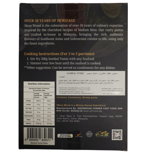 MAZE WOOD Sambal Tumis Paste 200gm brings the authentic taste of Malaysian cuisine to your kitchen. Crafted with premium chilies, garlic, and aromatic spices, this paste delivers a rich, spicy, and tangy flavor that enhances any dish.